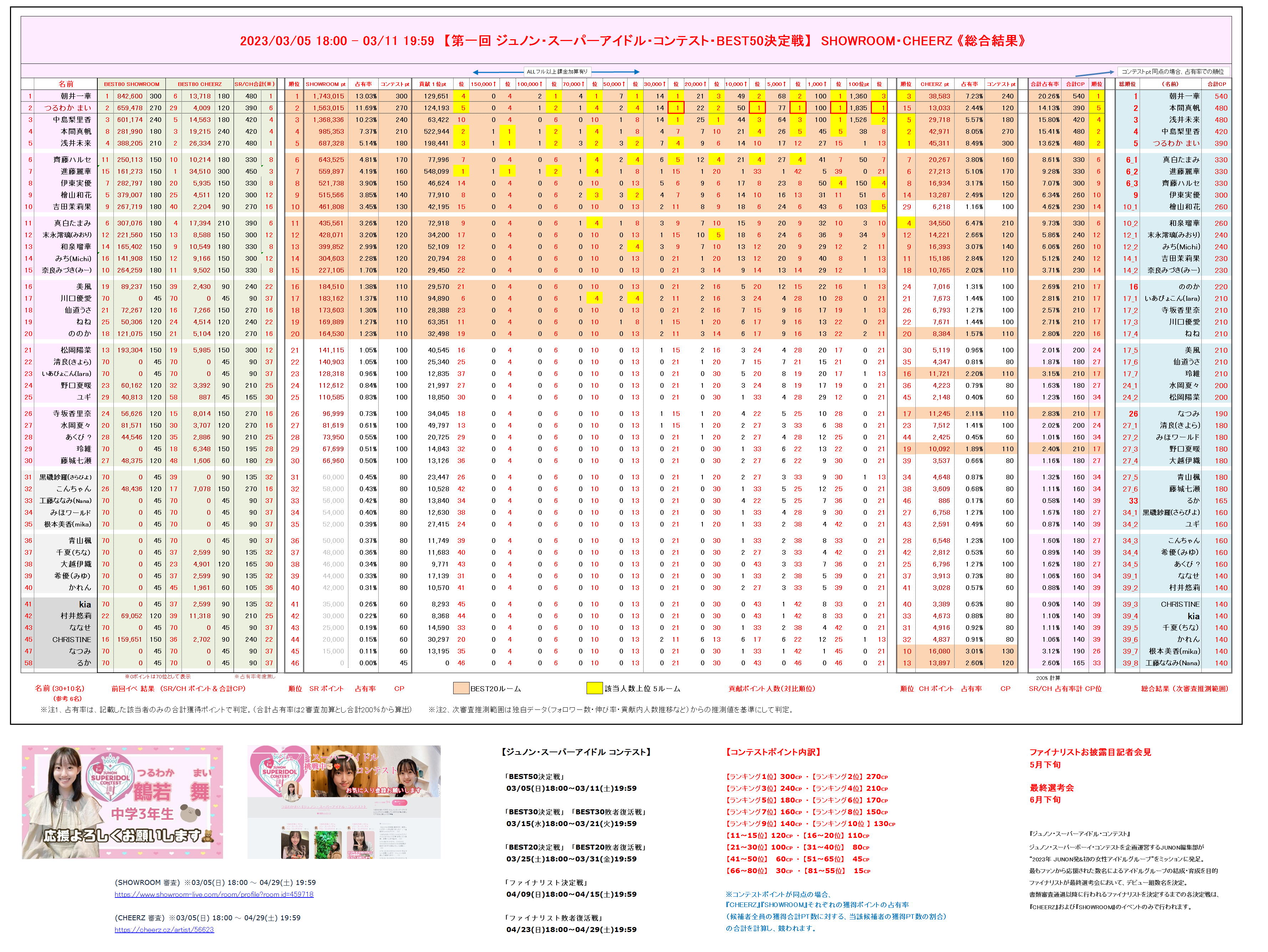 (SHOWROOM・CHEERZ 両審査のポイント占有率及び、コンテストポイント順位)